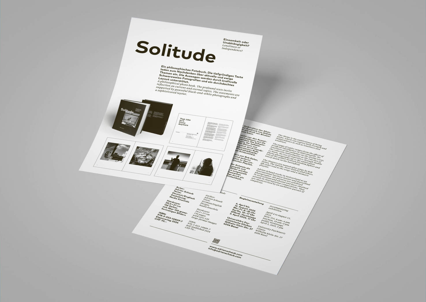 «Solitude – Einsamkeit oder Unabhängigkeit?» ist ein Buch zur Ambivalenz des Alleinseins, welche sowohl Ausdruck von Stärke und Unabhängigkeit wie auch von Einsamkeit und Schwäche sein kann. Tiefgründige Texte laden zum Nachdenken über aktuelle und ewige Themen ein und ergänzen die kraftvollen Schwarzweiss-Fotografien. Quersicht gestaltet und realisiert das zweisprachige Buch des Fotografen Adrian Schaub sowie einen Werbeflyer A5.