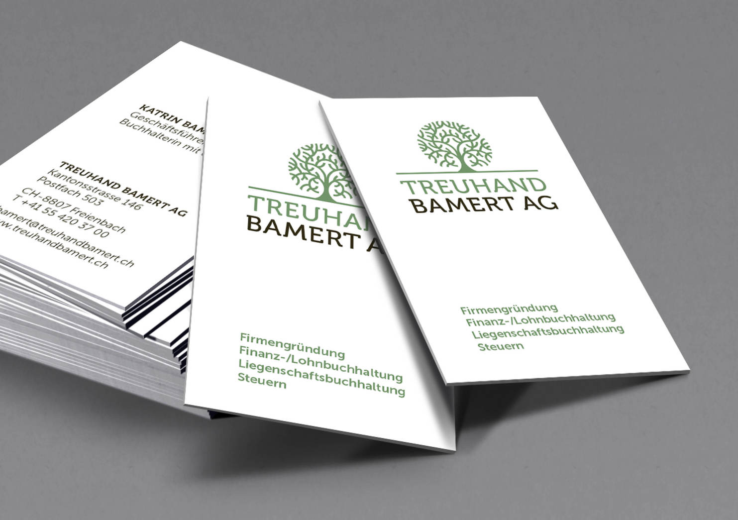 Welches ist die passende Rechtsform für Ihr Unternehmen? Die Mehrwertsteuer besser pauschal oder effektiv abrechnen? Treuhand Bamert AG weiss Bescheid. Seriös und geradlinig, aber mit dem gewissen Etwas – der neue Auftritt von Treuhand Bamert AG strahlt Kompetenz und Souveränität aus. Quersicht entwickelt für das persönliche Unternehmen aus Freienbach ein neues Logo, ein durchgehendes Briefschaftenprogramm, die Website sowie die Aussenkennzeichnung.