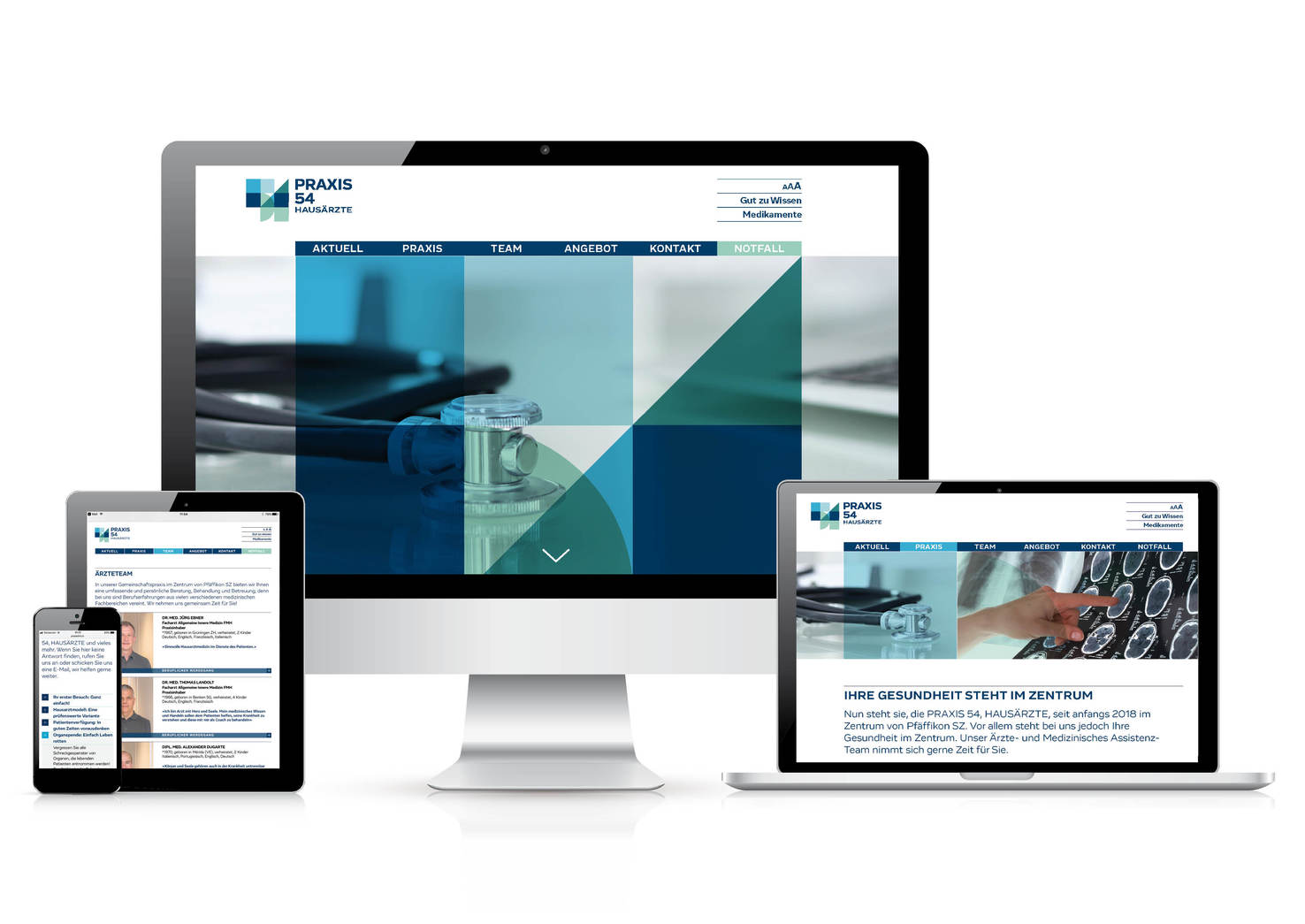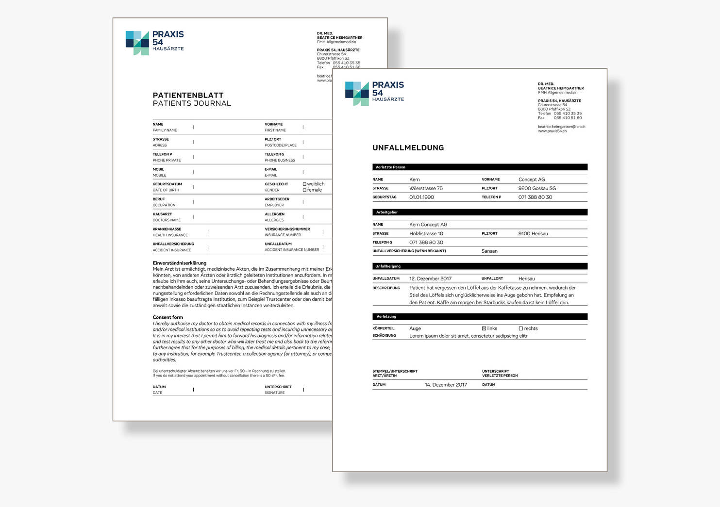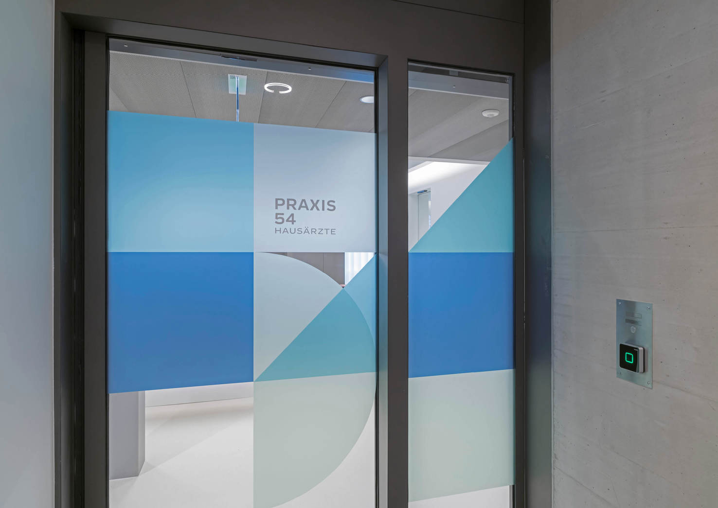 Alles neu an der Churerstrasse 54: der Umzug in topmoderne und grosszügige Praxisräumlichkeiten ist Anlass für ein komplett neues Erscheinungsbild der Hausärzte – inklusive Namensänderung. Im Zentrum des Auftritts steht das markante grafische Logo, dessen Farbwelt sich erfrischend durch den gesamten Auftritt zieht – von der Visitenkarte bis zur Kennzeichnung.