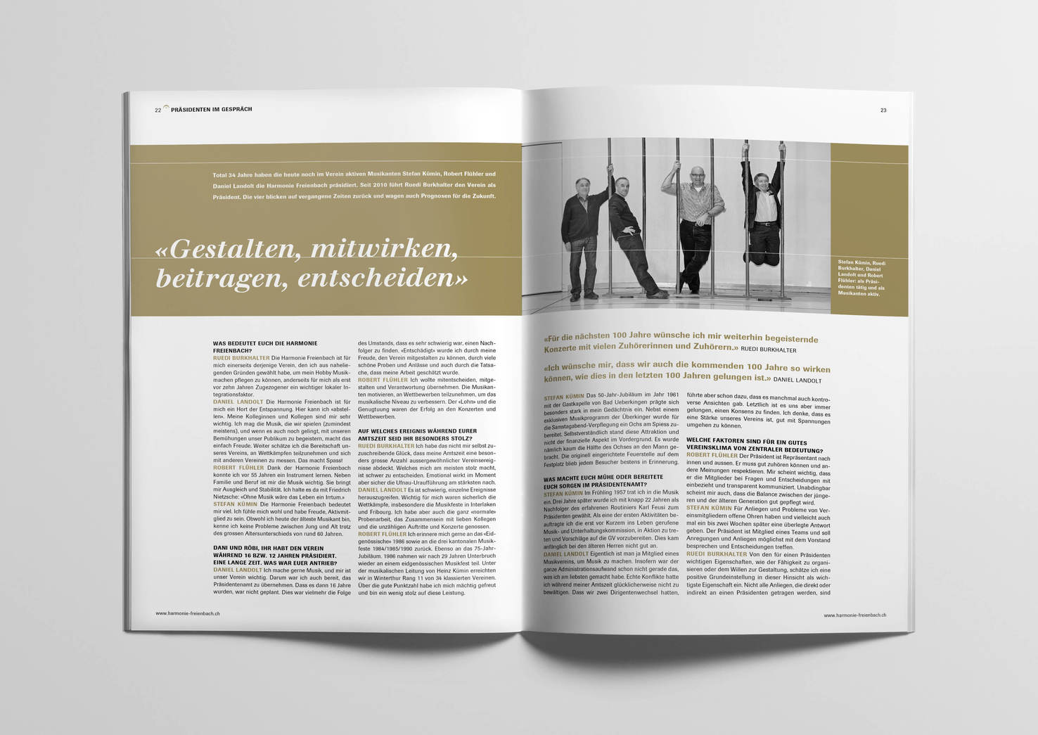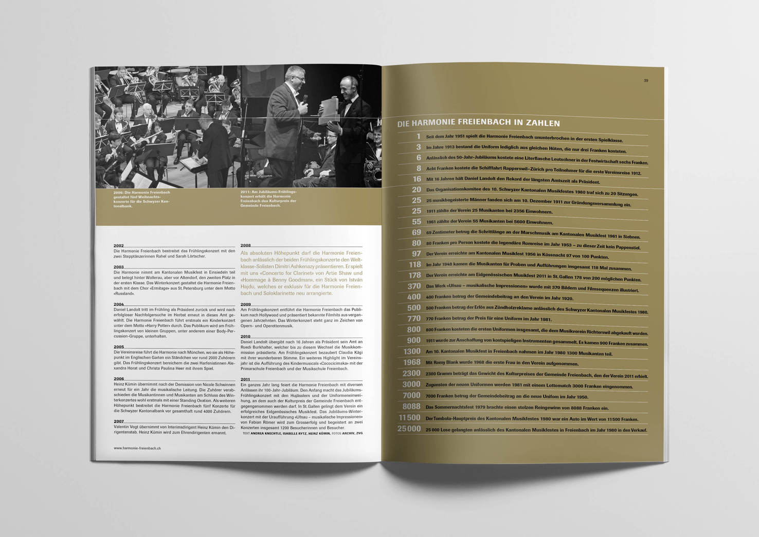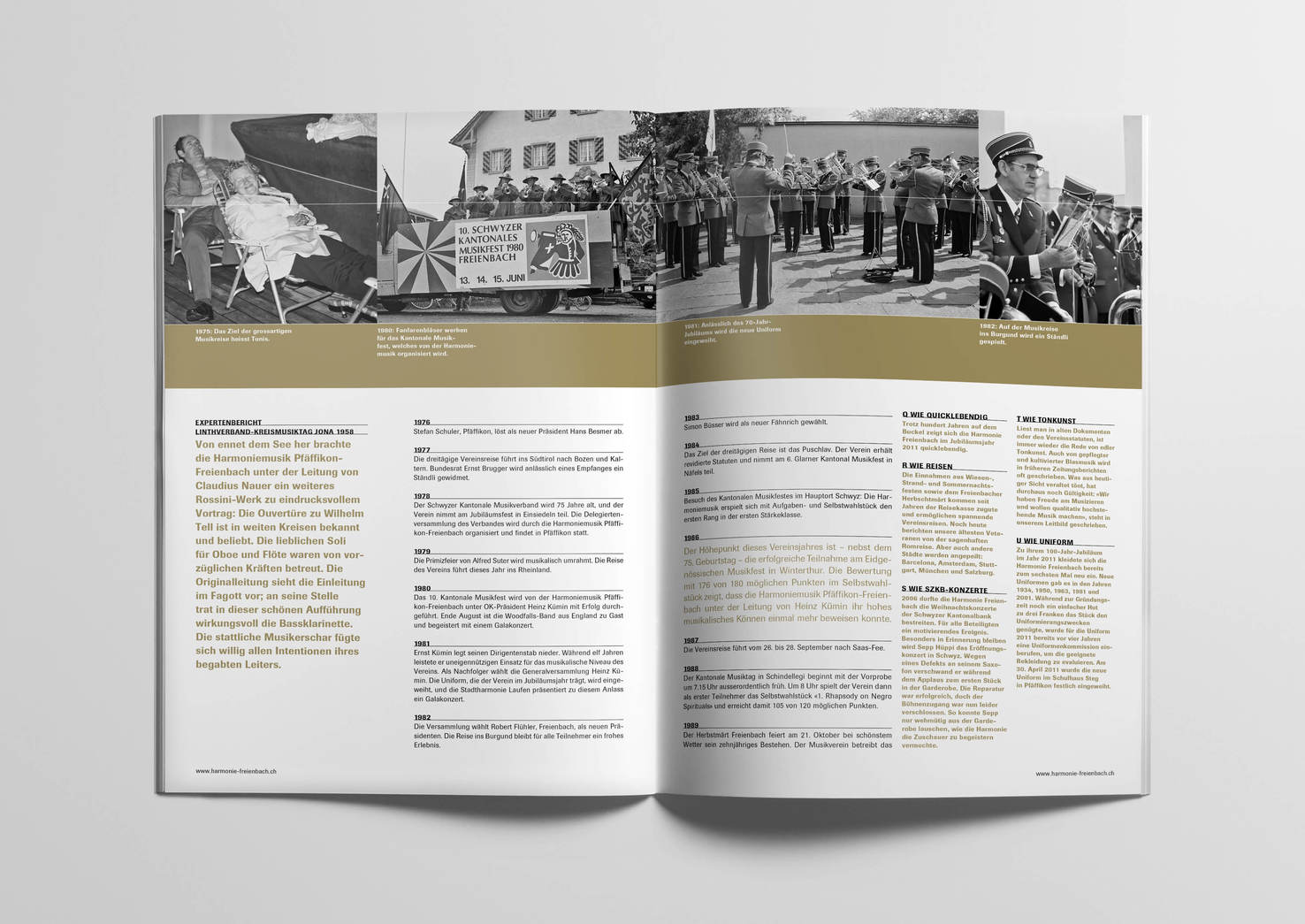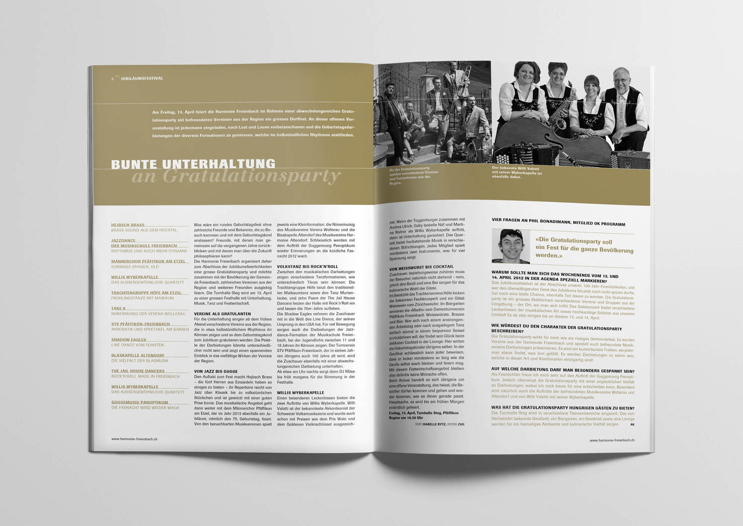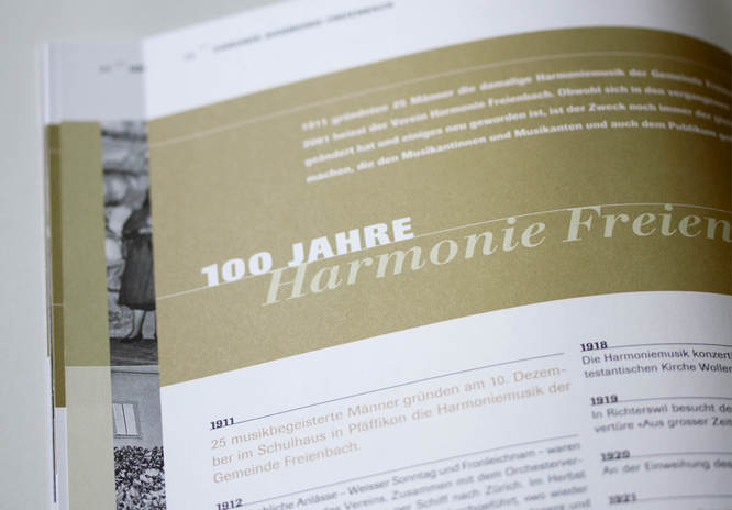Die Harmonie Freienbach feiert ihren 100. Geburtstag, und zwar unter dem Motto «1911–2011: 100 Jahre musizieren – 1 Jahr feiern». Zu diesem Jubiläum gestaltet Quersicht eine goldene Ausgabe der beliebten Vereinszeitschrift «fortissimo». Auf 48 Seiten werden Anekdoten aufgefrischt, auf goldene Zeiten zurück geschaut und visionär die nächsten hundert Jahre geplant.