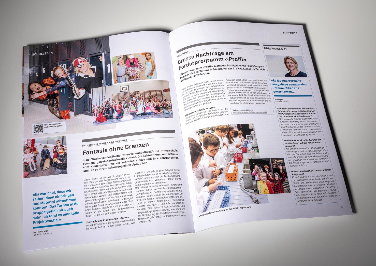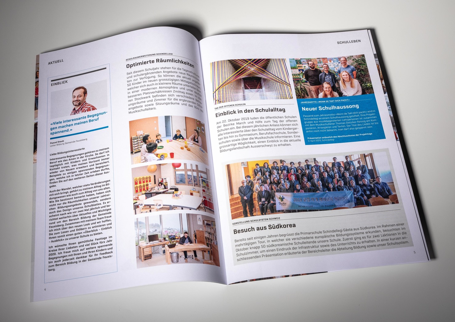 Die Primarschule der Gemeinde Feusisberg informiert mit dem Schulblatt zweimal jährlich über Aktuelles und Wichtiges aus dem Bereich Bildung. Quersicht entwickelt auf Basis des Erscheinungsbildes der Gemeinde ein attraktives und lesefreundliches Magazindesign mit einer klaren Dramaturgie. Aus einem Fundus von vorbereiteten prototypischen Seiten kann die Redaktion in Zukunft das Schulblatt eigenständig zusammenstellen und layouten. Selbstverständlich nach einer Schulung und bei Bedarf mit Unterstützung von Quersicht.