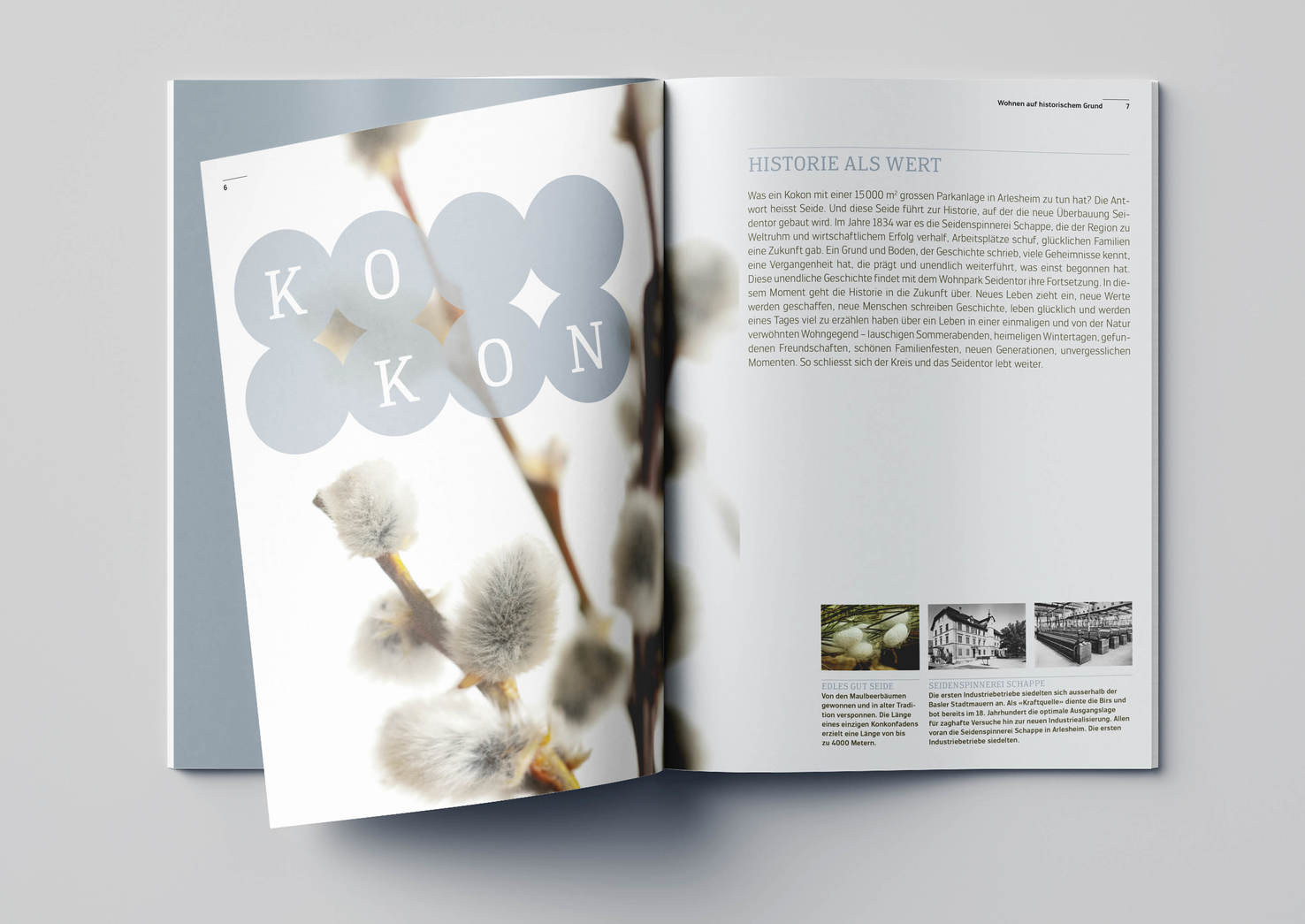Auf dem ehemaligen Gelände der Seidenspinnerei Schappe entstehen in Arlesheim grosszügige Eigentumswohnungen. An privilegierter Lage direkt am Fluss zieht mit dem Wohnpark Seidentor neues Leben ein. Quersicht entwickelt ein Bildkonzept basierend auf dem Thema Seidenkokon und Cocooning und gestaltet die Vermarktungsbroschüre.