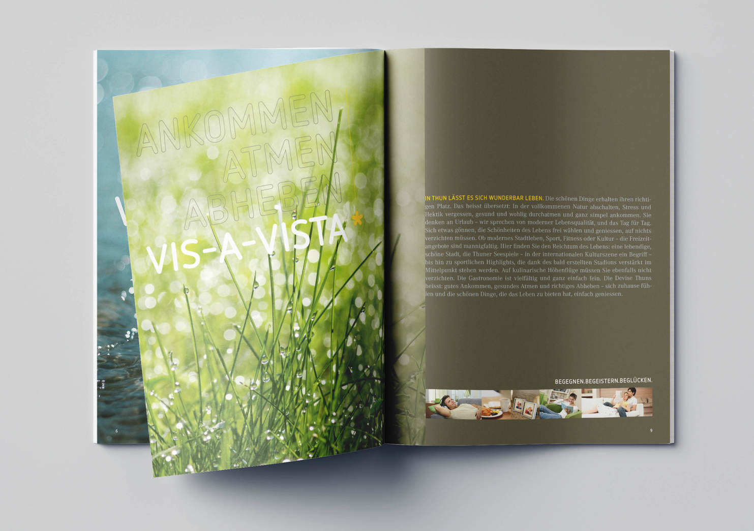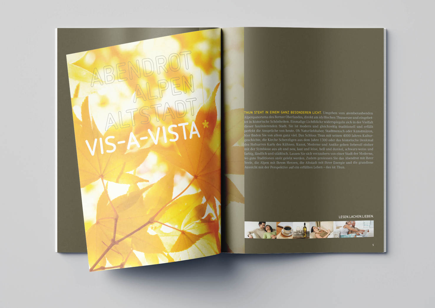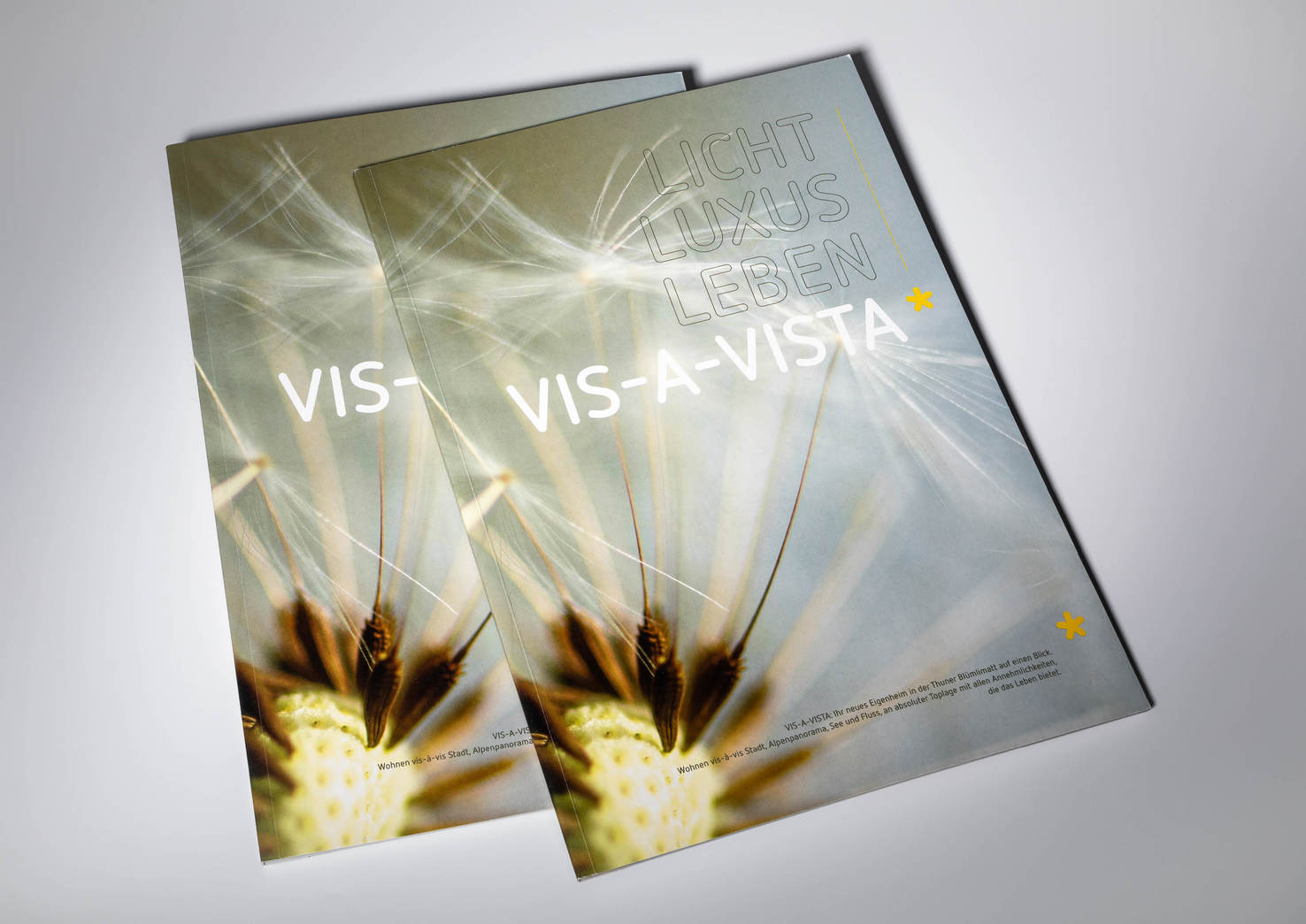 Wohnen vis-a-vis Stadt, Alpenpanorama und See: Die Eigentumswohnungen der Überbauung VIS-A-VISTA in Thun profitieren von einer unübertrefflichen Aussicht und viel Sonne. VIS-A-VISTA ist exklusives Wohnen und Leben in Thun. Quersicht entwickelt den klangvollen Namen VIS-A-VISTA und gestaltet eine Immobilienbroschüre mit emotionalen Bildern und grosszügiger Typografie.