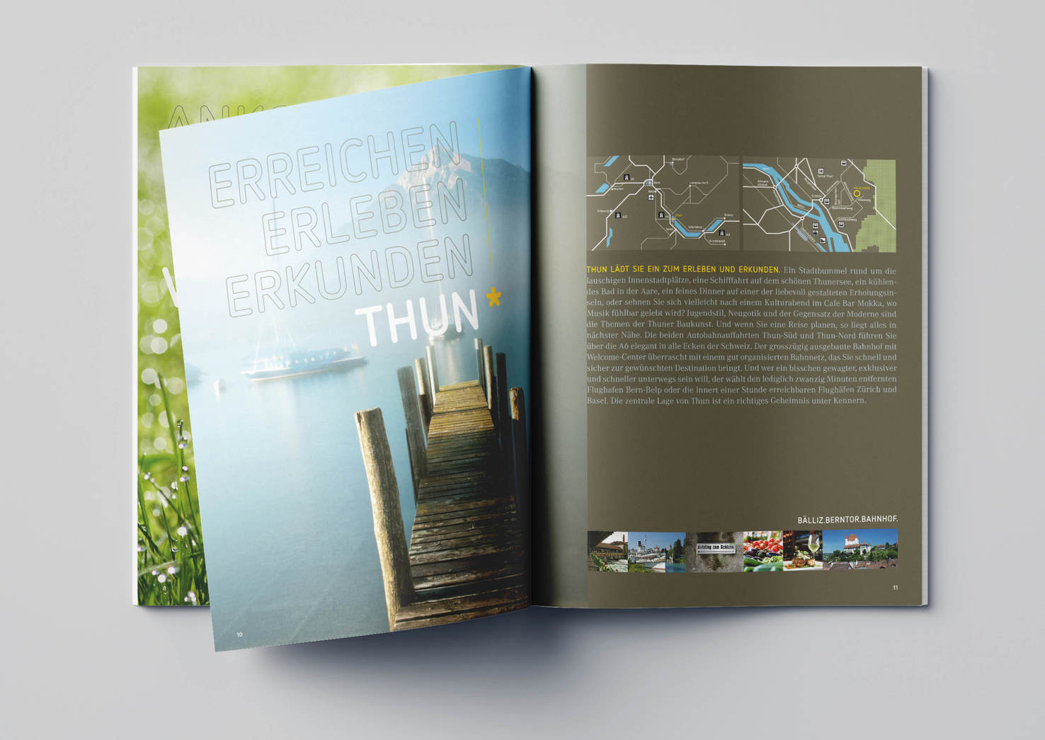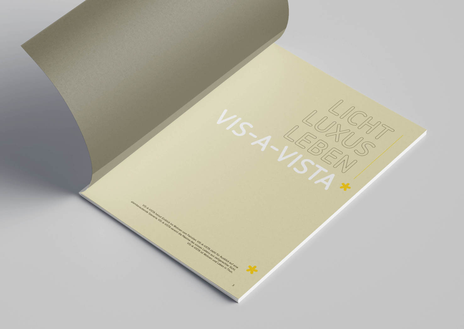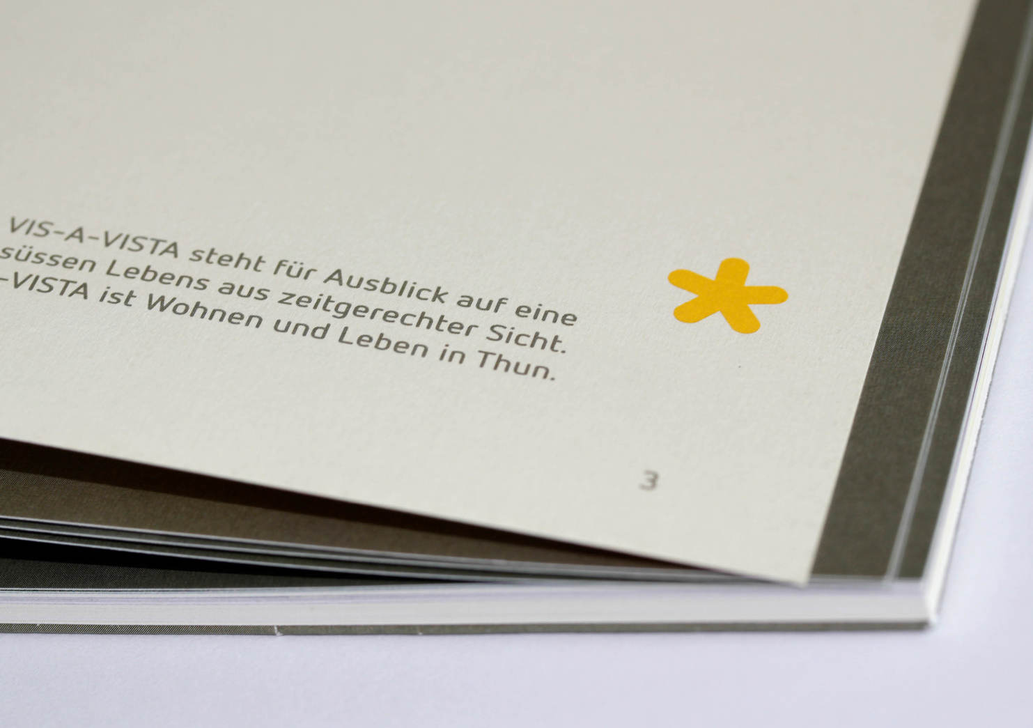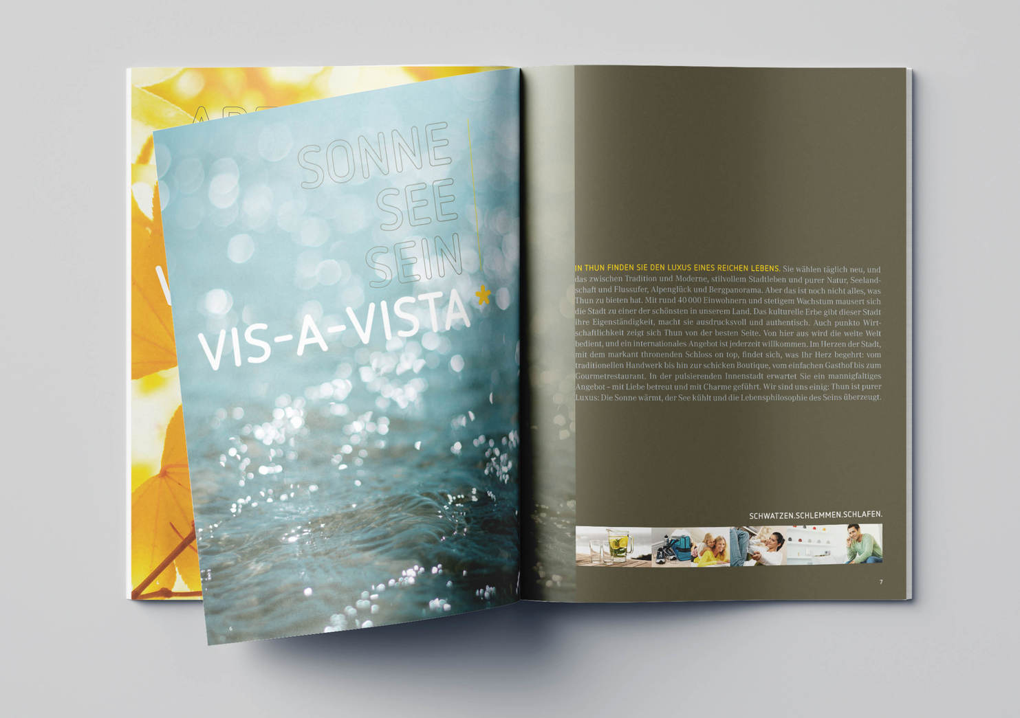 Wohnen vis-a-vis Stadt, Alpenpanorama und See: Die Eigentumswohnungen der Überbauung VIS-A-VISTA in Thun profitieren von einer unübertrefflichen Aussicht und viel Sonne. VIS-A-VISTA ist exklusives Wohnen und Leben in Thun. Quersicht entwickelt den klangvollen Namen VIS-A-VISTA und gestaltet eine Immobilienbroschüre mit emotionalen Bildern und grosszügiger Typografie.