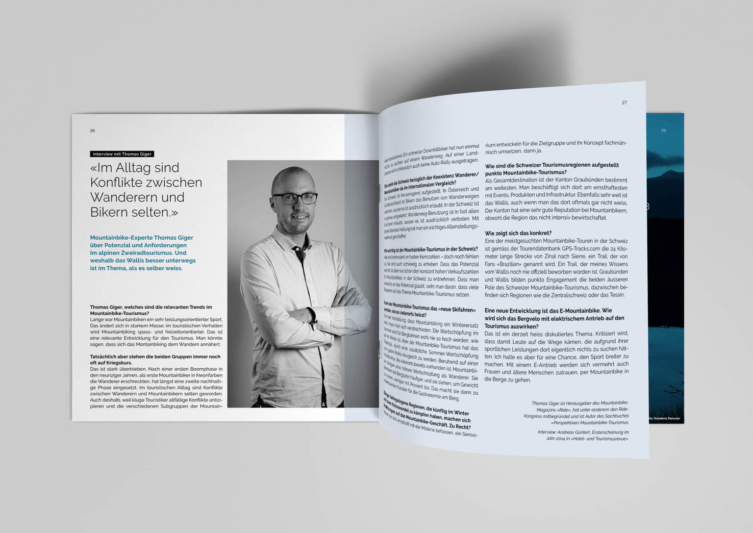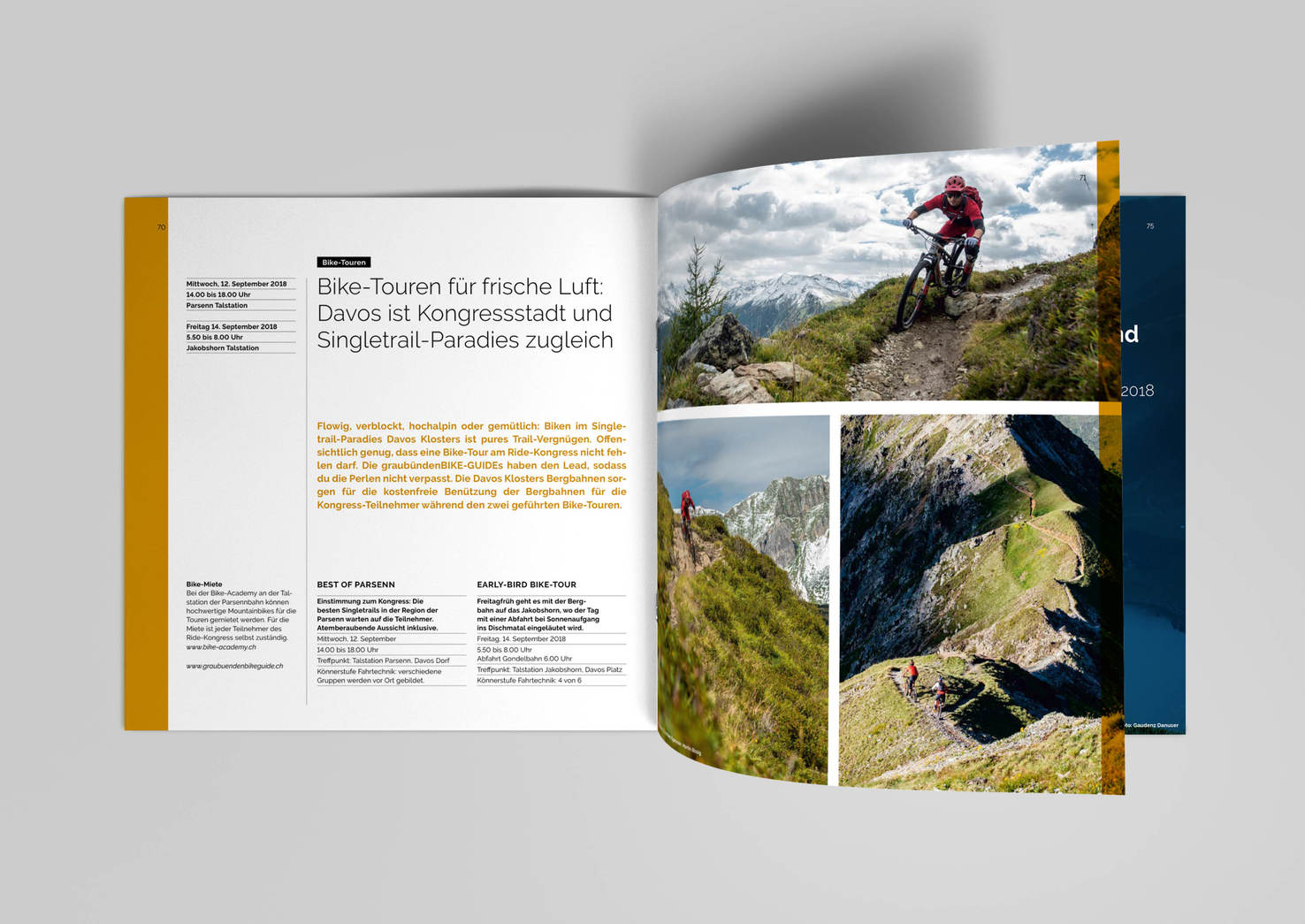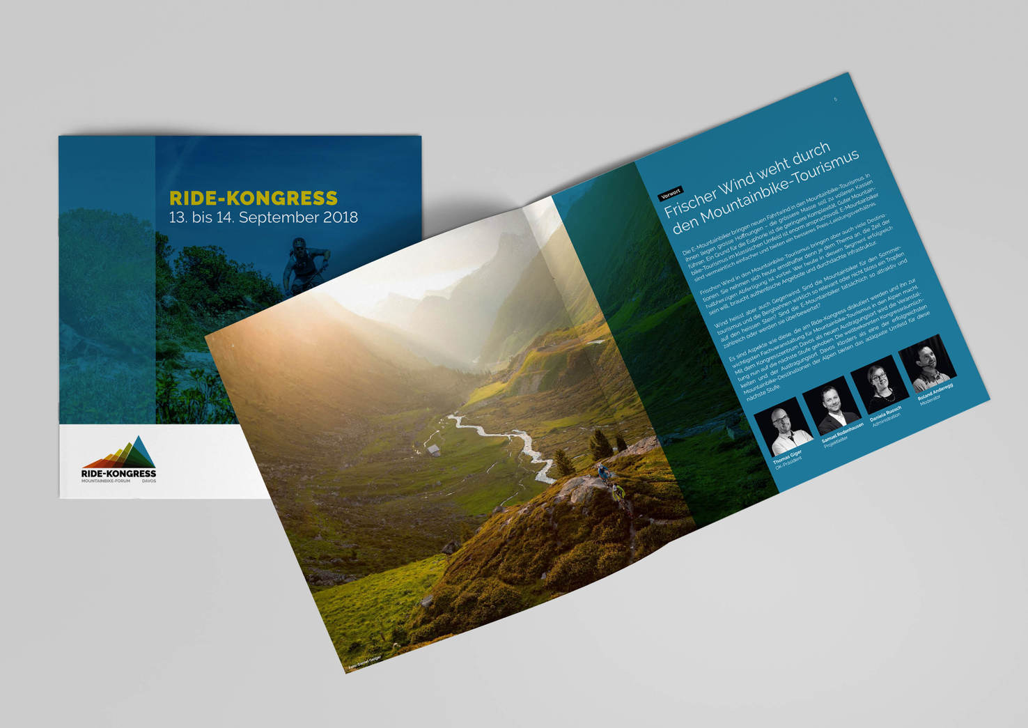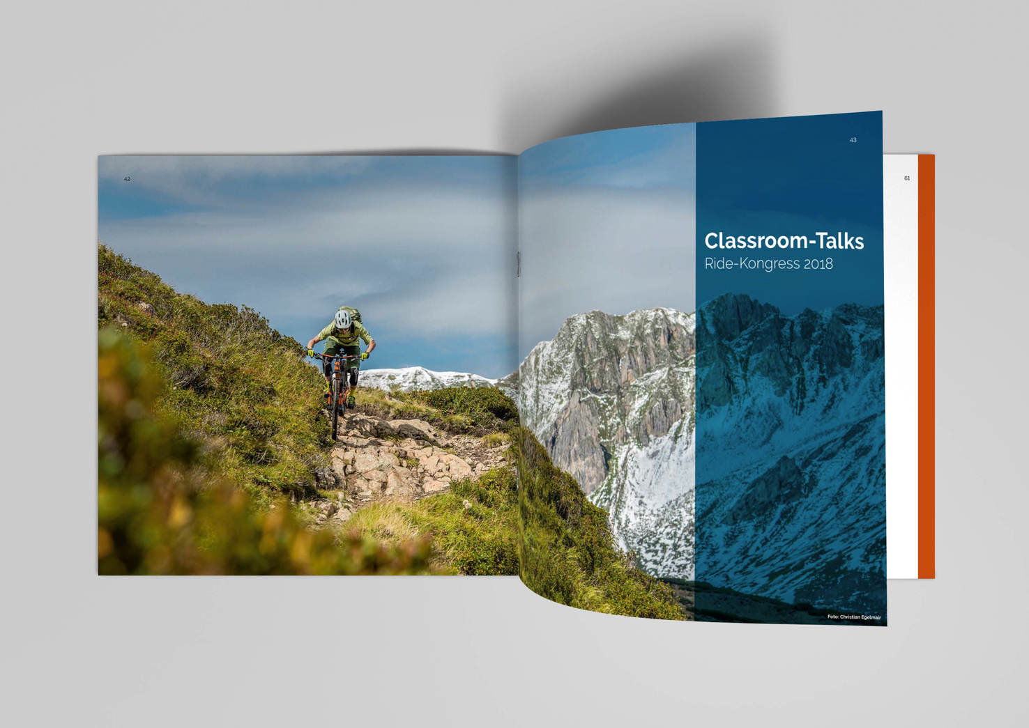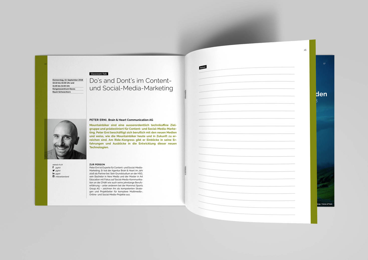 Am Ride-Kongress präsentieren hochkarätige Referenten aktuelle Themen und spannende Projekte zum Mountainbike-Tourismus. Hinter der Veranstaltung steht die Absicht, Mountainbiking als Sportart und vor allem auch als Tourismusfaktor zu stärken und zu fördern. Damit die Teilnehmenden wissen, wo, wann, was läuft gestaltet Quersicht ein übersichtliches Booklet mit Programmübersicht, Referentenporträts, Interviews und Bildstrecken.