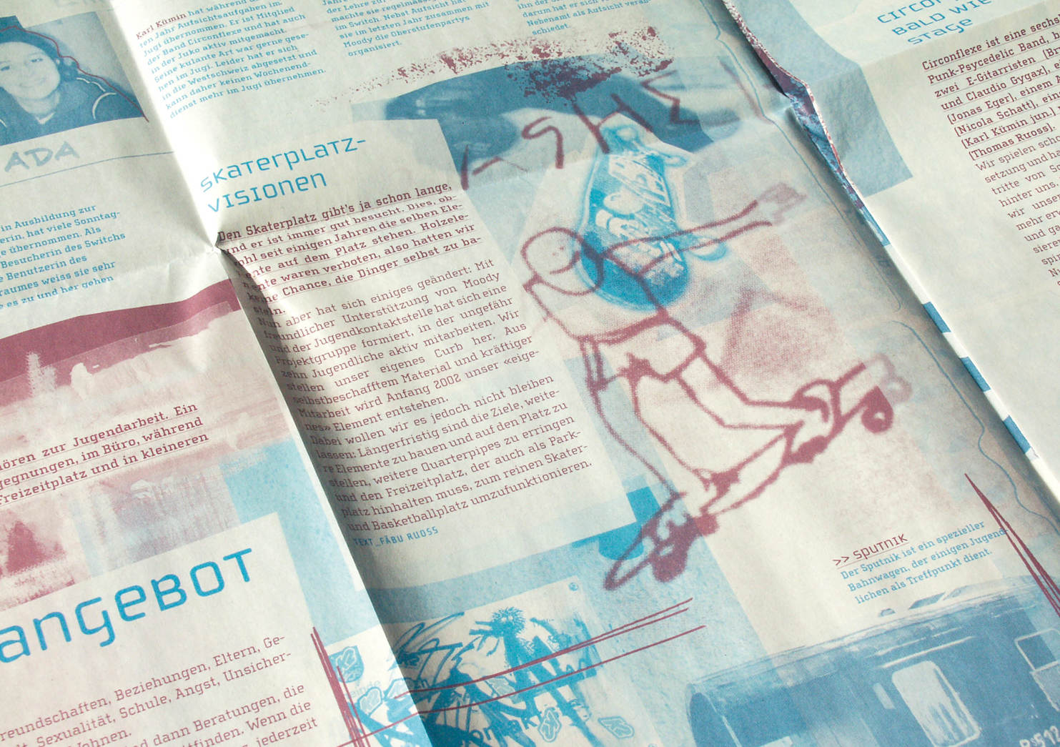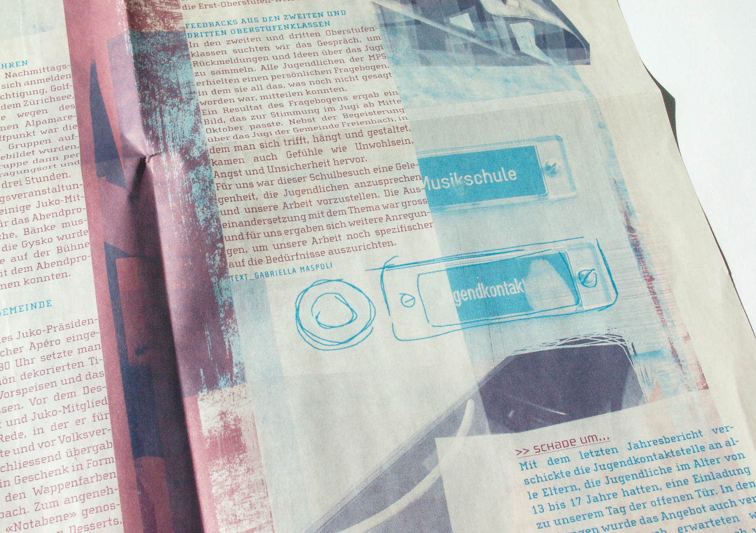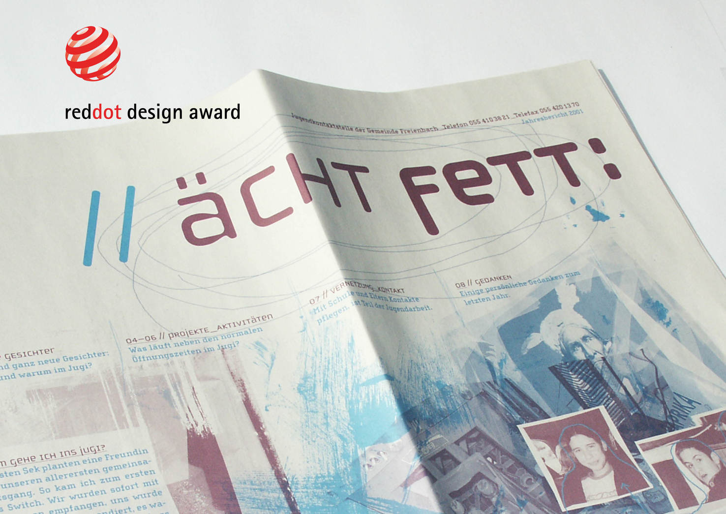 Graffitis, Kritzeleien, Skizzen, Malstrukturen und Fotos sind die Zutaten für das unkonventionell-schräge Bildkonzept des Jahresberichtes für die Jugendkontaktstelle der Gemeinde Freienbach. Auf Zeitungspapier gedruckt, überzeugt die Publikation auch die internationale Red Dot Jury, welche die Gestaltung mit einem Award für hohe Designqualität auszeichnet.
