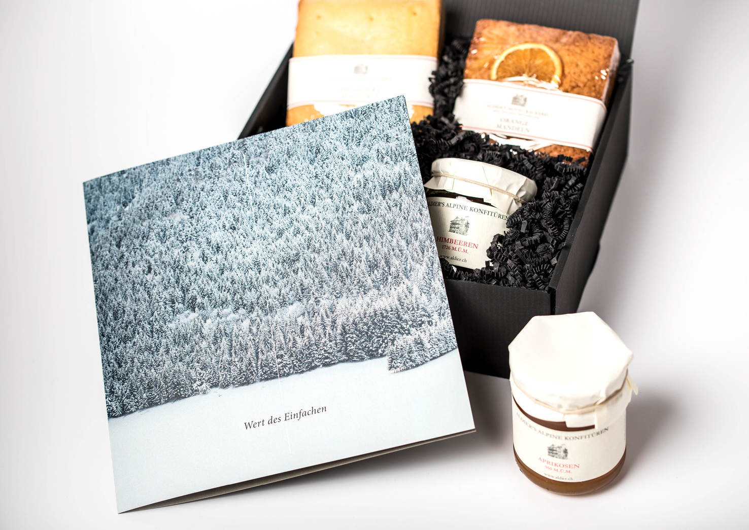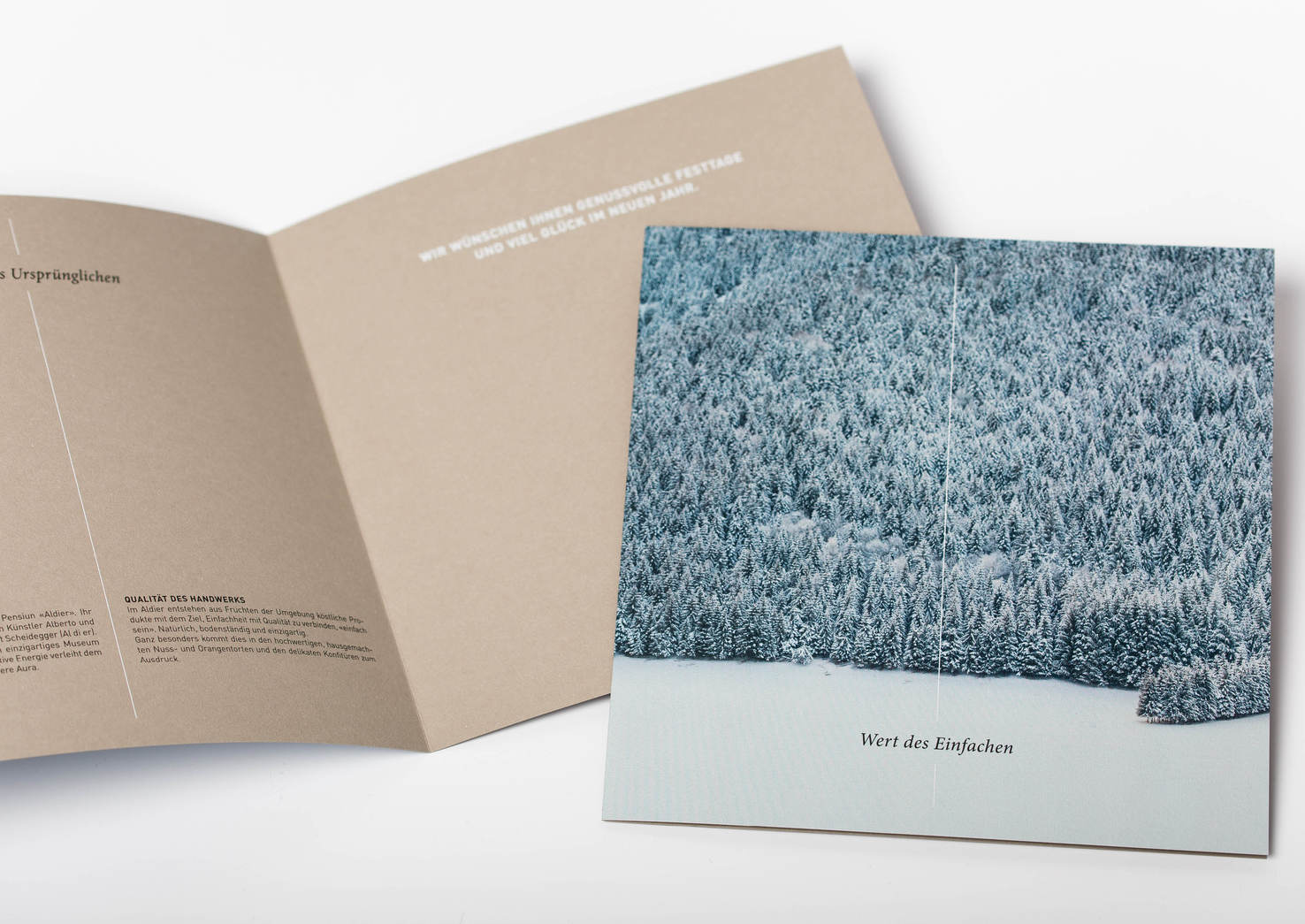 Für Spaeni Grundstücke+Bauten AG gestaltet Quersicht das jährliche Weihnachtsgeschenk für deren Kunden mit hausgemachten Nusstörtchen und Konfitüren aus dem Engadin sowie einer stilvollen Begleitkarte. Das haptische Erlebnis des Naturpapiers und der Digitaldruck mit Weiss widerspiegeln die Authentizität und Einzigartigkeit der Produkte.