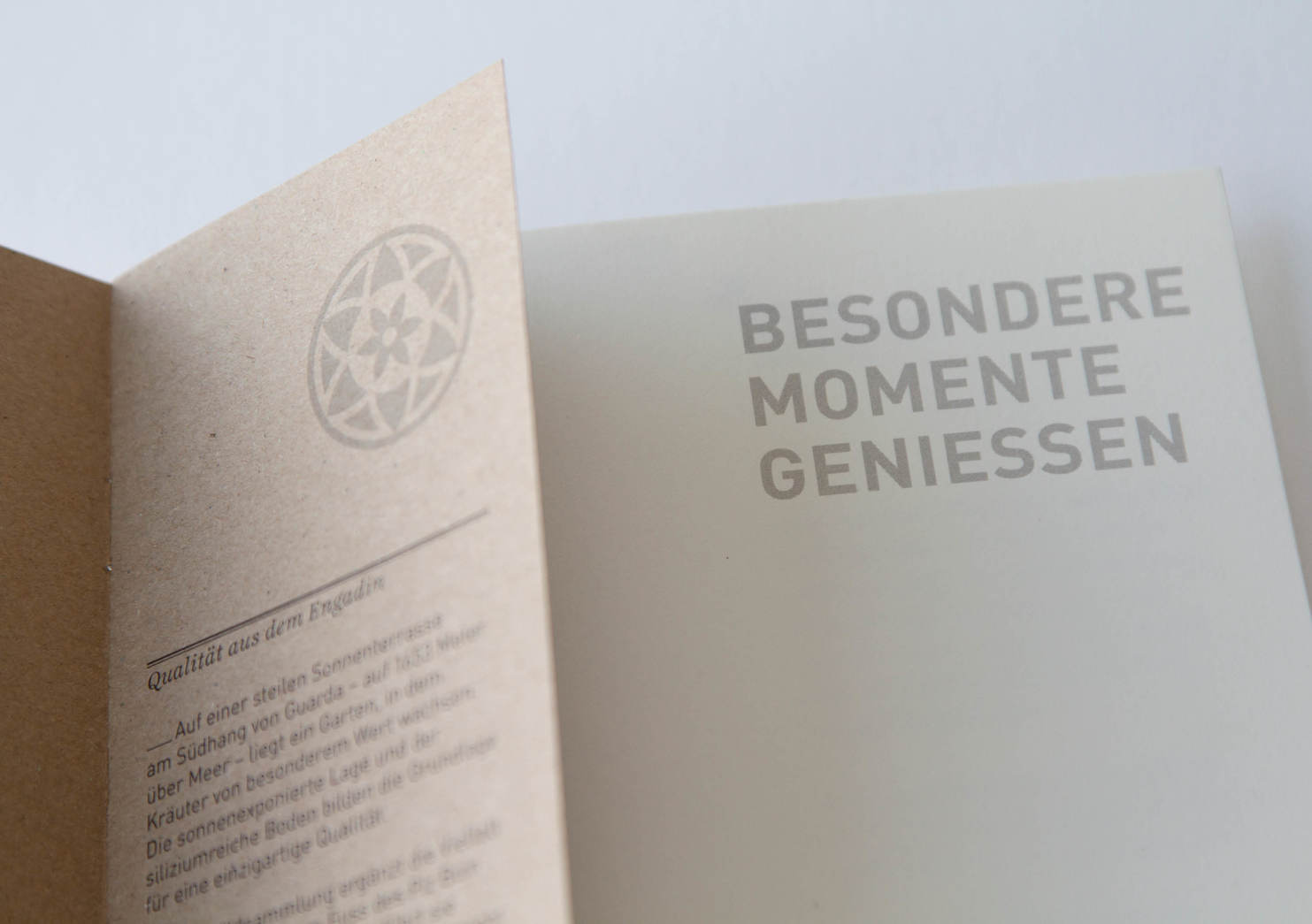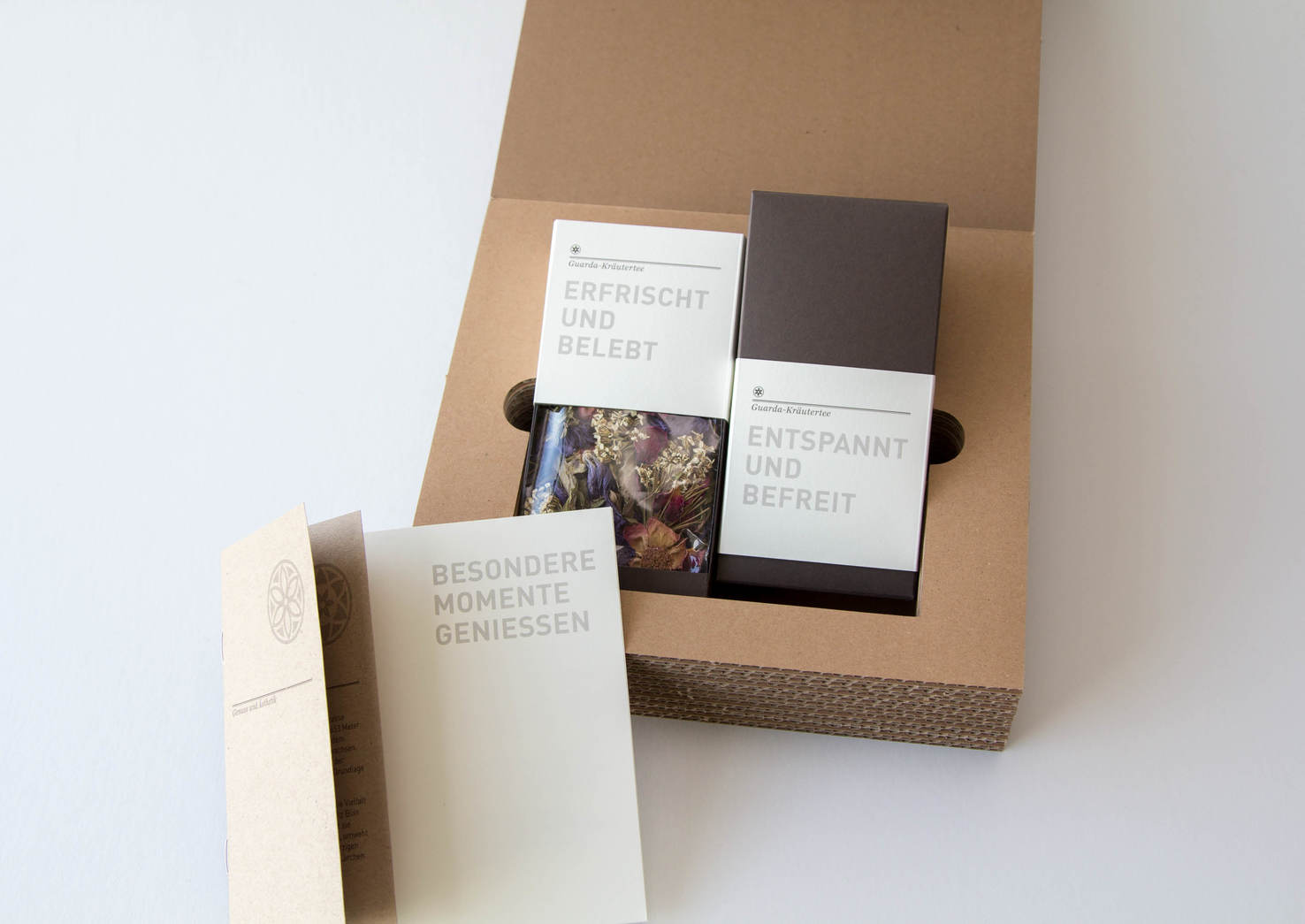 Die Tees der Manufaktur «Guarda Kräuter» bestehen aus einzeln gepflückten, ganzen Blättern und Blüten. Für Spaeni Grundstücke+Bauten AG konzipiert und gestaltet Quersicht ein Weihnachtsgeschenk mit diesem qualitativ hochwertigem Kräutertee. Die Verpackung offenbart die schönen Blüten des Tees und schützt dank verschiebbarer Banderole den lichtempfindlichen Inhalt. Der Versand wird komplettiert durch ein Booklet und eine Grusskarte.