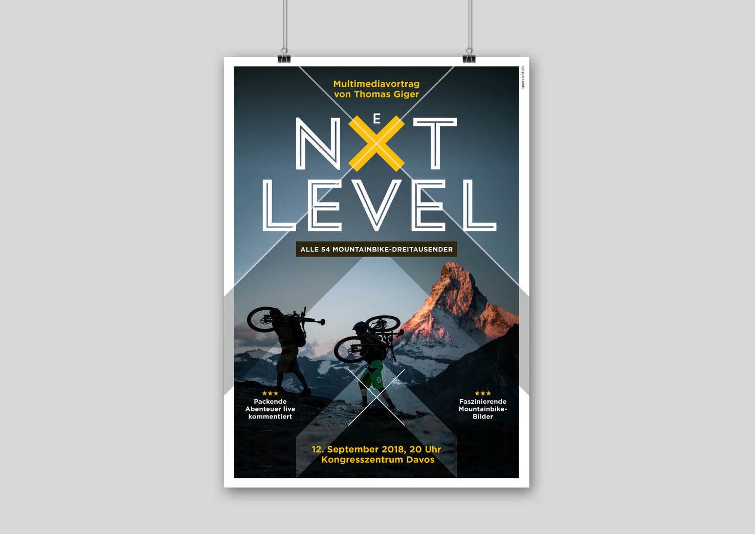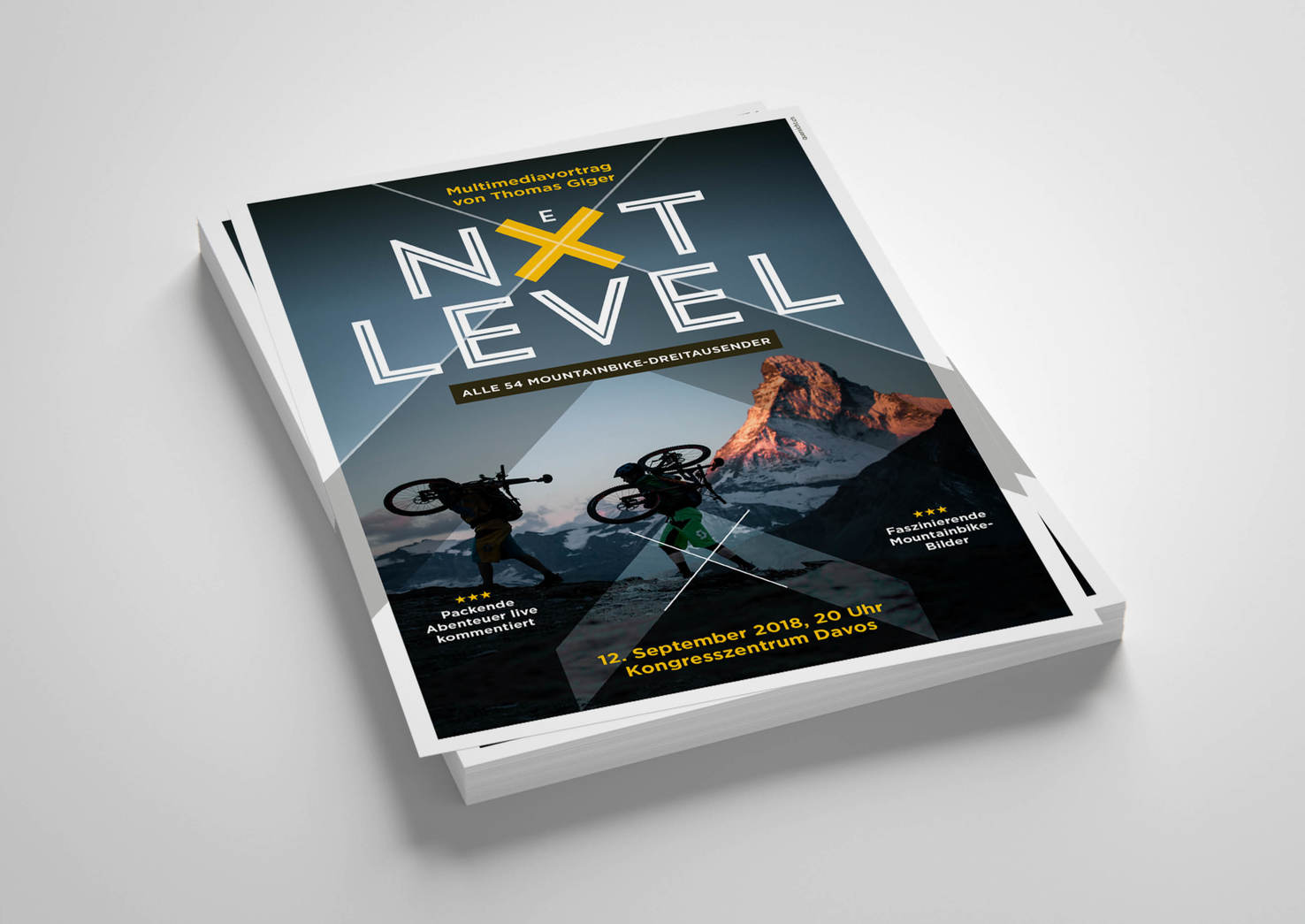 In den Alpen gibt es 54 Mountainbike-Ziele über 3000 Meter über Meer. Ride-Herausgeber Thomas Giger hat sie als Erster alle geschafft, und daraus entstanden ist die eindrückliche Multimedia-Show «Next Level». Quersicht gestaltet den Flyer und das Plakat zu diesen grossen Abenteuern in dünner Luft abseits der Komfortzone.