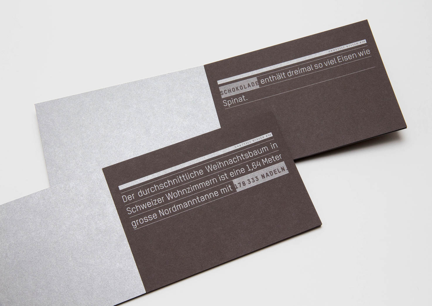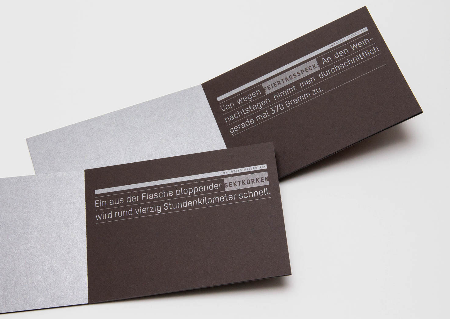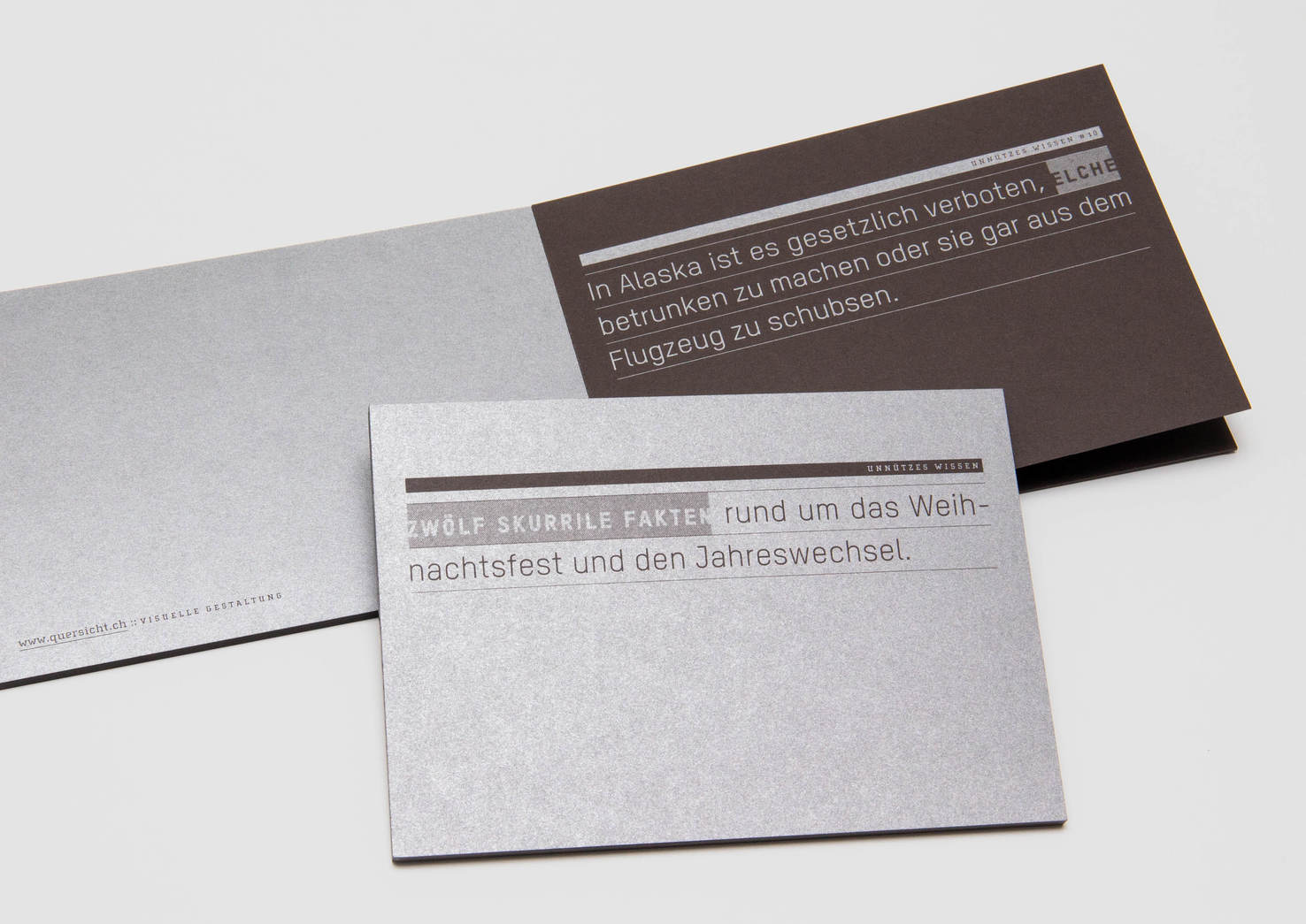 Gewusst? Ein durchschnittlich grosser Christbaum besitzt 178 333 Tannennadeln und ein aus der Flasche ploppender Sektkorken erreicht eine Geschwindigkeit von vierzig Stundenkilometern. Das Kartenset «Unnützes Wissen» beschreibt unterhaltsam und überraschend zwölf Fakten rund um das Weihnachtsfest und den Jahreswechsel. Quersicht wünscht mit der zur Tradition gewordenen Endjahres-Postkartenserie allen Geschäftspartnern ein herrlich unbeschwertes und glückliches neues Jahr.