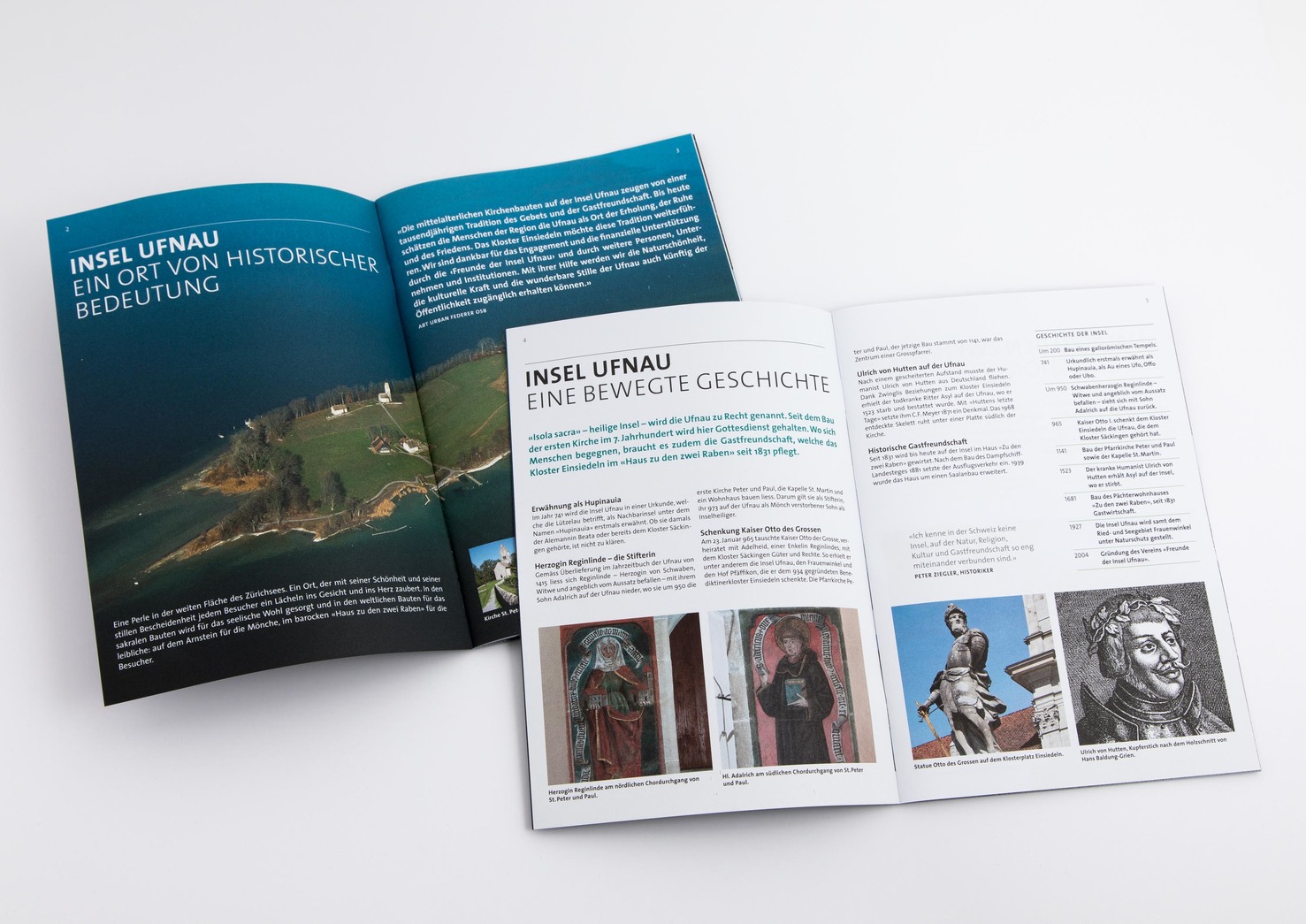 Die Insel Ufnau im Zürichsee ist ein Kleinod von besonderer Schönheit und gehört seit mehr als 1050 Jahren dem Kloster Einsiedeln. Der Verein «Freunde der Insel Ufnau» unterstützt das Kloster in seiner kulturgeschichtlichen Verantwortung auf der Ufnau ideell und finanziell und hat dazu verschiedene Publikationen herausgegeben. Quersicht gestaltet einen Flyer, eine Spendenbroschüre und einen Sonderdruck mit Beiträgen des Tages-Anzeigers zur grössten Insel der Schweiz.